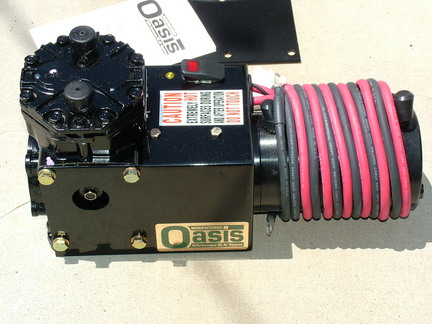 The Oasis HP1000 compressor is a monster! It is basically a York compressor mounted to a 5hp modified winch motor that can run on either 12v or 24v DC. |