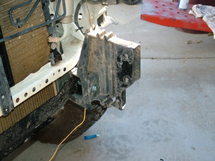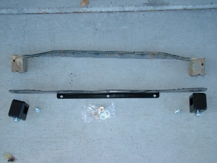 Here you can see the old crush can and scrape plate mounting crossmember and the new mounting pieces. Instead of being one piece, there are two blocks and a crossmember. |