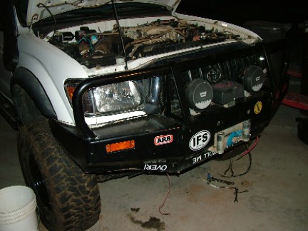 As soon as the order for my 2001 Double Cab was placed I called ARB and asked which Bull Bar I would need to mount on the front. I was given a part number which I found at a local distributor and ordered. I actually had the ARB bumper and Warn winch in the garage before the truck arrived! Once I started working on installing the new bumper, I found that the instructions that came with it were not so great. Once again I called ARB and now was told that they did not yet make a bumper for the 2001 model. They thought that it would fit, but they had never actually installed one. It turned out that the instructions were just bad, but not incorrect. I had to cut the front mounting plates off the crush cans, then use longer bolts to bolt through them to the end of the frame. The only problem with the new 01 model year was that the back of the two uprights slightly hit the front grille. About a year later, I was talking to an ARB rep about my experience and he said that they had a new mounting kit for the bumper. My mounting setup was OK and he said that I did not have to worry about it coming off, but they would send me the updated kit. The kit arrived and them sat in my garage for over a year waiting to be installed. I was not that anxious to pull the front bumper off to install the kit, but when I had to pull it off to install the transmission cooler anyway I installed the updated mounts. For more info on the original mounts, see the initial install page. PLEASE READ ALL THE NOTES NEXT TO THE PICTURES! WE FOUND A DIFFERENCE BETWEEN THE OLD AND NEW PARTS! |
