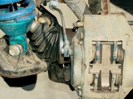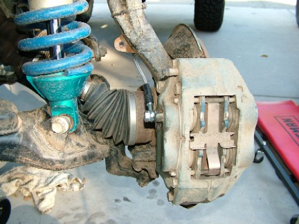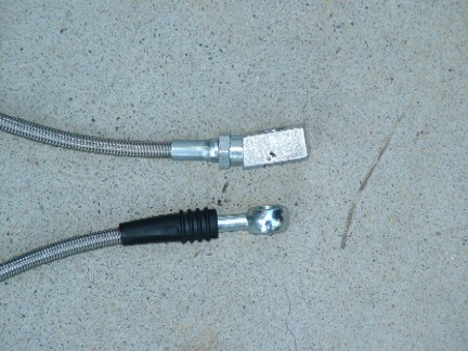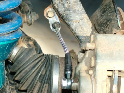 The first few pictures are of the Pro-Comp lines and how they were routed. Because of the large block banjo fitting and the small tab on the caliper the line has to exit going straight up. |