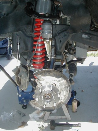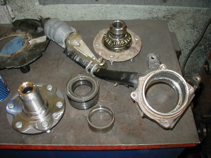 With the upper ball joint loose, the spindle comes off the truck. It is off to Auto Parts Unlimited to have the press work done. |