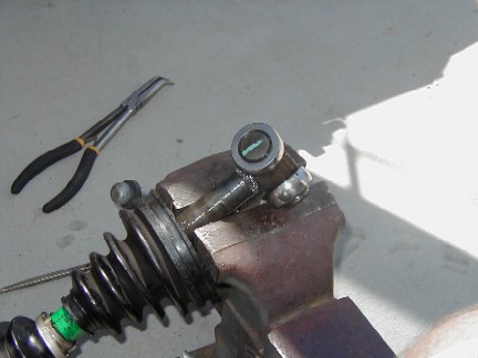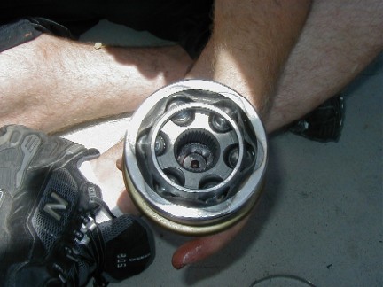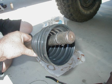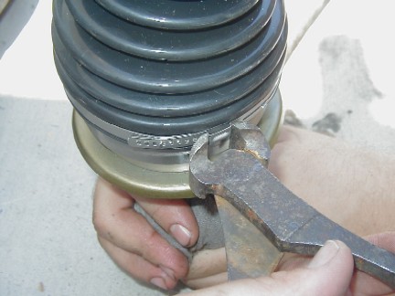 The first step was to cut the old bands that hold the boots on. The inner joint slips apart when you remove the boot, then you have to remove the joint from the shaft. Be careful so as to not knock the rollers off! We used a pliers to open the C clip up and let it slip down the shaft. |