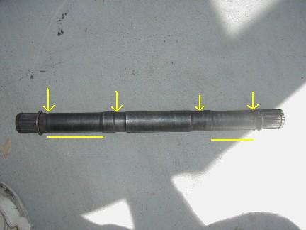 Also note that on the new shafts, the grooves are not the same on both ends. In this picture, you can see that the end towards the left of the picture has more space between the grooves than on the right side. There are similar grooves on the stock shafts, so make sure it all goes back together the same way it came apart! The arrows point at the grooves. The lines underneath show the difference in length. |