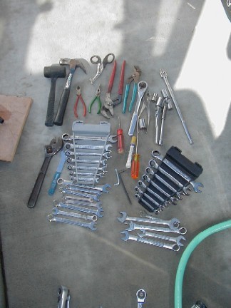 Here you can see everything that I have in the tool box. There are tools, the factory jack, fire extinguisher, TP, a can of fix a flat, tire plug and patch kits, 2 emergency blankets, 2 emergency rain ponchos, a small air compressor, repair kit for the ARB air line, misc nuts bolts and screws, valve core tool and extra valve cores, radiator bars leak, and an assortment of other goodies. The wooden planks that the stuff is setting on are also stored at the front of the bed between the front bed wall and the storage box and gas cans. These are good when you are in the snow, mud or sand and need a firm base for you jack or something to put under the tires. |
