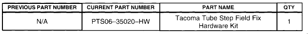 ACCESSORIES AX003-02 July 26, 2002 Title: Models: Introduction A Tacoma Tube Step (by Steel Horse) Field Fix Hardware Kit has been created for dealers to repair abnormal noise conditions (i.e., squeaking, rattling, and/or knocking) stemming from the Tacoma Tube Steps. As of April 15, 2002 (Date Code: 15D02), all production kits have been produced without nut plates. Refer to the date code located on the part number label. Date Code nomenclature XXYZZ: XX = Date Y = Corresponding month (A = January, B = February, etc.) ZZ = Year The Tacoma Tube Step Field Fix Hardware Kit (PTS06-35020-HW) contains: ^ 4 each:
