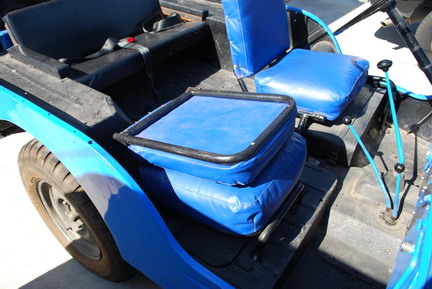 The passenger seat pictured below is not the stock seat but we like it. The back folds down and it also tumbles forward to access the storage compartment underneath. This seat is slightly smaller than the original seat, so I ordered a canvas kit for the stock seat and we will cut it down a bit to make it work. |