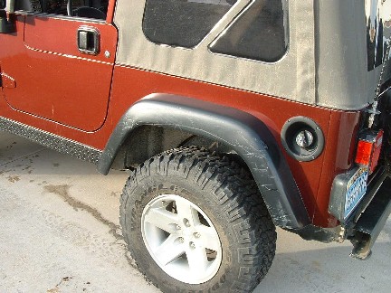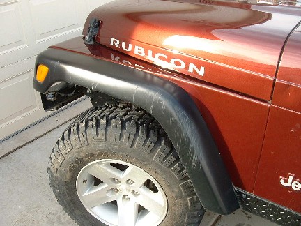The small dent in the middle right of the picture was caused by a high lift jack. The scratches in the flare were when he fell in one of the large ditches (really large!) at Lake Pilsbury. |