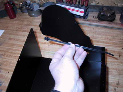 Place the air shield on a bench that will not scratch the surface. Install the zip ties into the holes provided. Three zip ties on the large side face inward. |