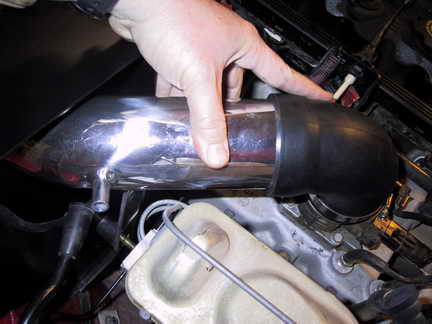 | Since everything is still loose, you can move the shield and pipe around for best clearance and fit. Tighten the hose clamps on the throttle body and the air tube. Do not tighten the air filter clamp yet. | |