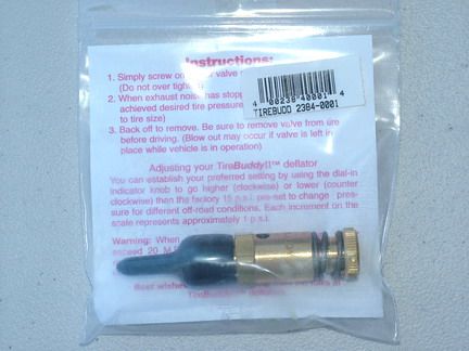Here is the package as we received it. These are very simple to set and use. The Tire Buddy II comes pre-set from the factory at 15psi, but can be adjusted anywhere from 10-30psi. To change the preset pressure, simply turn the adjusting screw clockwise to increase the tire pressure, or counterclockwise to decrease the tire pressure. The indicator marks in the body each represent about 1psi. |