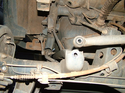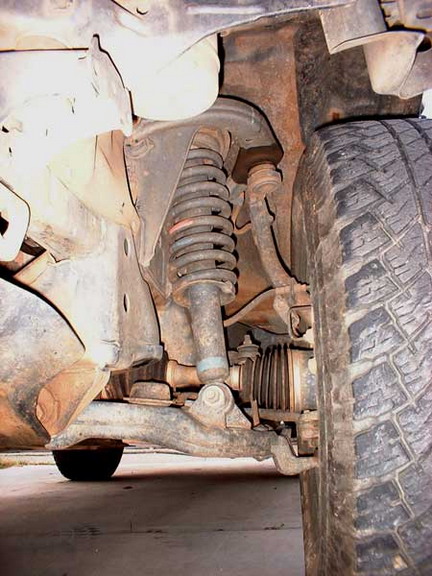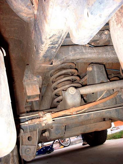 Once the axle is lowered enough, they just come right out. In this picture the track bar is disconnected and the spring is out. |