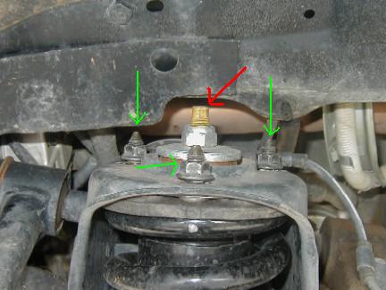 When removing the top of the factory strut, you have to be careful to only remove the mounting nuts, shown here in green and not the larger center nut shown here in red. Removing the large center nut can result in the strut and spring coming apart and cause serious injury! |