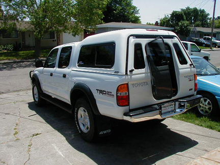 Here is a picture of the rear of the shell. You can see the smaller glass door and the handles to open the larger swing up door. As you can see, I decided to replace the OEM badges that the truck had on the tailgate. Because the contours of the shell match that of the truck, with the OEM badges, it has an almost factory look. |