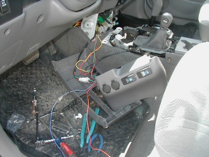 Here the inside is all put back together. I did cheat on one thing: the instructions call for two wires, one to be hooked up to a keyed power source (one that is on only with the ignition switch), and one to be connected to a dash light circut. I put both wires to the keyed circut. This means that like my tilt meter, (the wire I tapped into) when the ignition is on, the switches will be lit up. |
