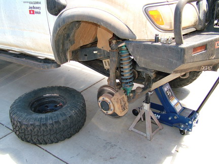 Changing out the front rotors and pads is fairly straight forward. Raise and safely support the vehicle. Remove the wheel. |