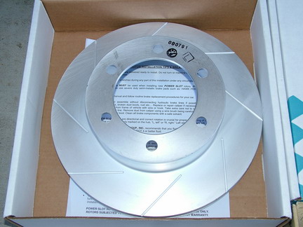 The new rotors are installed. Note that there is an "R" on this rotor, as the new ones do have a left and right side. |