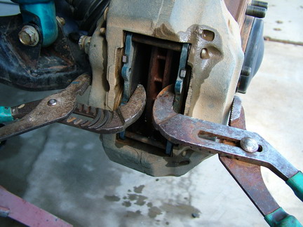 With the wire clip out, you can remove the pins that keep the brake pads in place. The brake pads can now be removed. With the brake pads out, you can finish removing the caliper bolts and move the caliper out of the way. Don't let it hang by the brake line, use a piece of wire or something similar to hang them so the line is not being pulled on. |