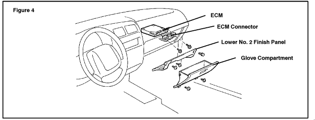 Noise Located at Airbag Assembly Loosen airbag, reposition and retighten bolts to specified torque. Please refer to the Technical Information System (TIS): 2004 model year Tacoma Repair Manual: Body (Mechanical) Instrument Panel. Noise Located at ECM Remove ECM and apply EPT sealer (P/N 08231-00810) to insulate the bracket from the ECM. Noise Located at Reinforcement Bar