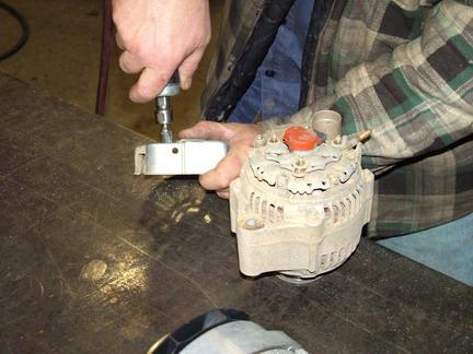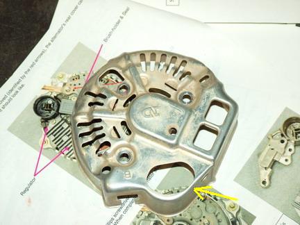 The rear cover had to be slightly modified to allow for the new round plug to fit properly.. (yellow arrow) After you modify the alternator by enlarging the hole there is no going back to stock! If you are under warranty and the alternator fails, the dealership will not replace it as they will be able to see that it was modified. |