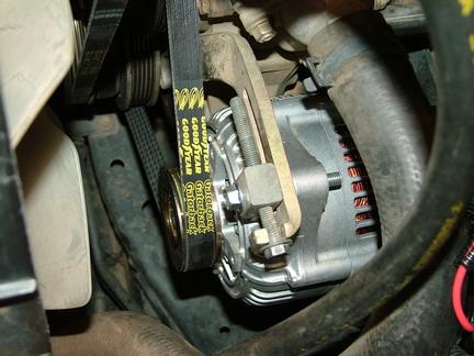 The one thing that you need to know before you start the installation of the new alternator is that due to the larger pulley size, the stock belt is now too small. The stock belt measured 34 3/8th inches. We first tried a 36 inch belt and it was too long, there was no room to add tension. We then went with a 35 inch belt and it was perfect. The alternator belt is the rear most belt on the 4cyl engine, so you have to remove the other belts to get this one on. Once the new belt is on, you can adjust the tension and attach the wiring. |