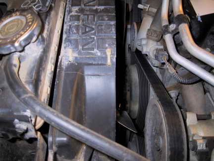 Here you can see two zip ties on the shroud. We had to replace the thermostat when the vehicle was purchased . So To facilitate the job, we cut the shroud into two pieces. This allowed for removal and replacement the shroud with ease. |