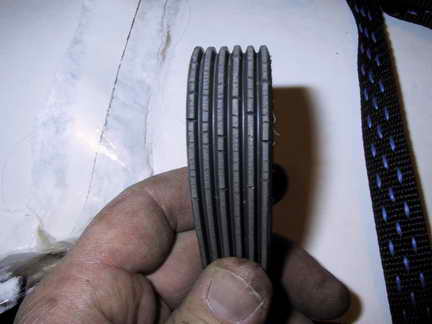 There is the old belt. When you see cracks like this on the "inside" of the belt, its time for a new one. My new belt came courtesy of Absolute Off-Road, in Grand Junction. We installed the new one. Check the diagram of the belt against the belt on the Jeep before you remove it. Ours was wrong. |