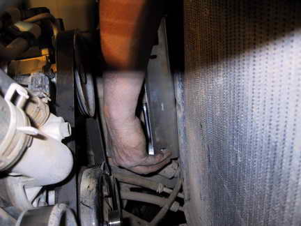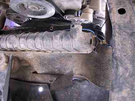 | This is under the radiator. After you splice the wires for the fan, run them up and away from moving parts to the top of the engine compartment. I used a zip tie to secure the position of the wires onto the base of the radiator. | |