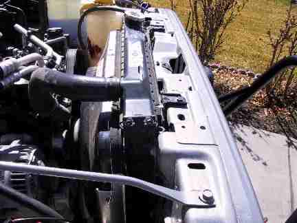 Here is the stock fan and shroud, If you notice the shroud is down a bit. This is due to a one inch body lift, and we did not raise the engine. So the fan shroud had to be dropped one inch. |