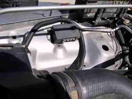 I mounted the control box where the air filter box used to be. Pre drill the holes and use the self tapping screws from Flex-A-Lite. Make sure you don't place it where it will be over exposed to heat, mud, water, etc. The Brute Force air intake system fits here also. (Not pictured) There is enough room for the filter and the fan box. The filters heat/splash shield will protect the relay box well. |