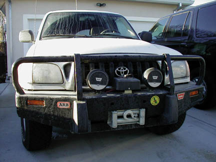 | A slight modification that you may not use all the time is extra off-road lights. I decided to mount two Warn 500 flood lights to the ARB Bull Bar. When looking at lights you must decide what they will be used for. Because off-road driving is a low speed thing, I choose the flood lights. They do not have a long range like driving lights or spot lights, but because I am going slow, I am not so worried what is 2000 feet in front of me, I care what is directly in my path. | |